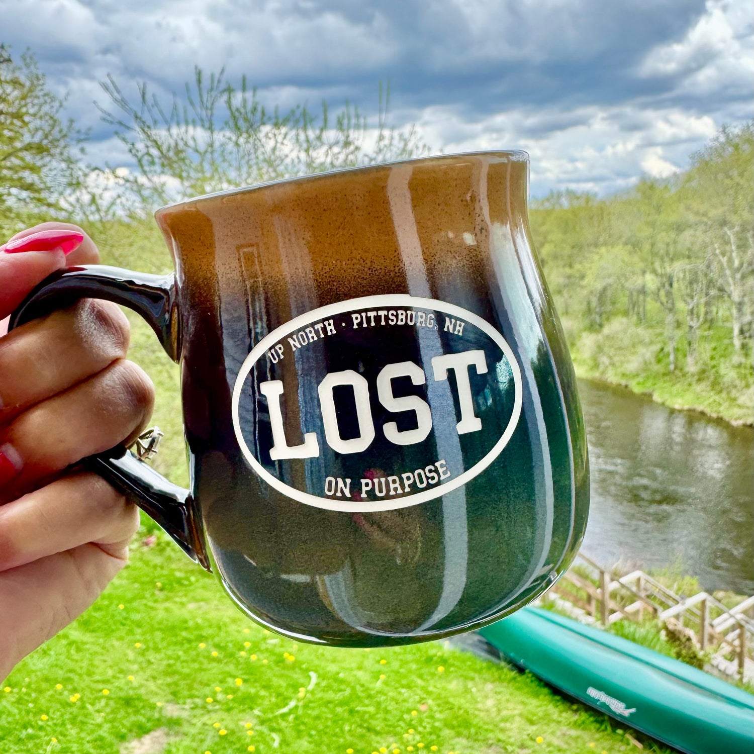 16 oz rustic mug perfect for coffee, tea or any drink of your choice! Etched with our Up North branded "Lost on Purpose" logo. Made New Hampshire.