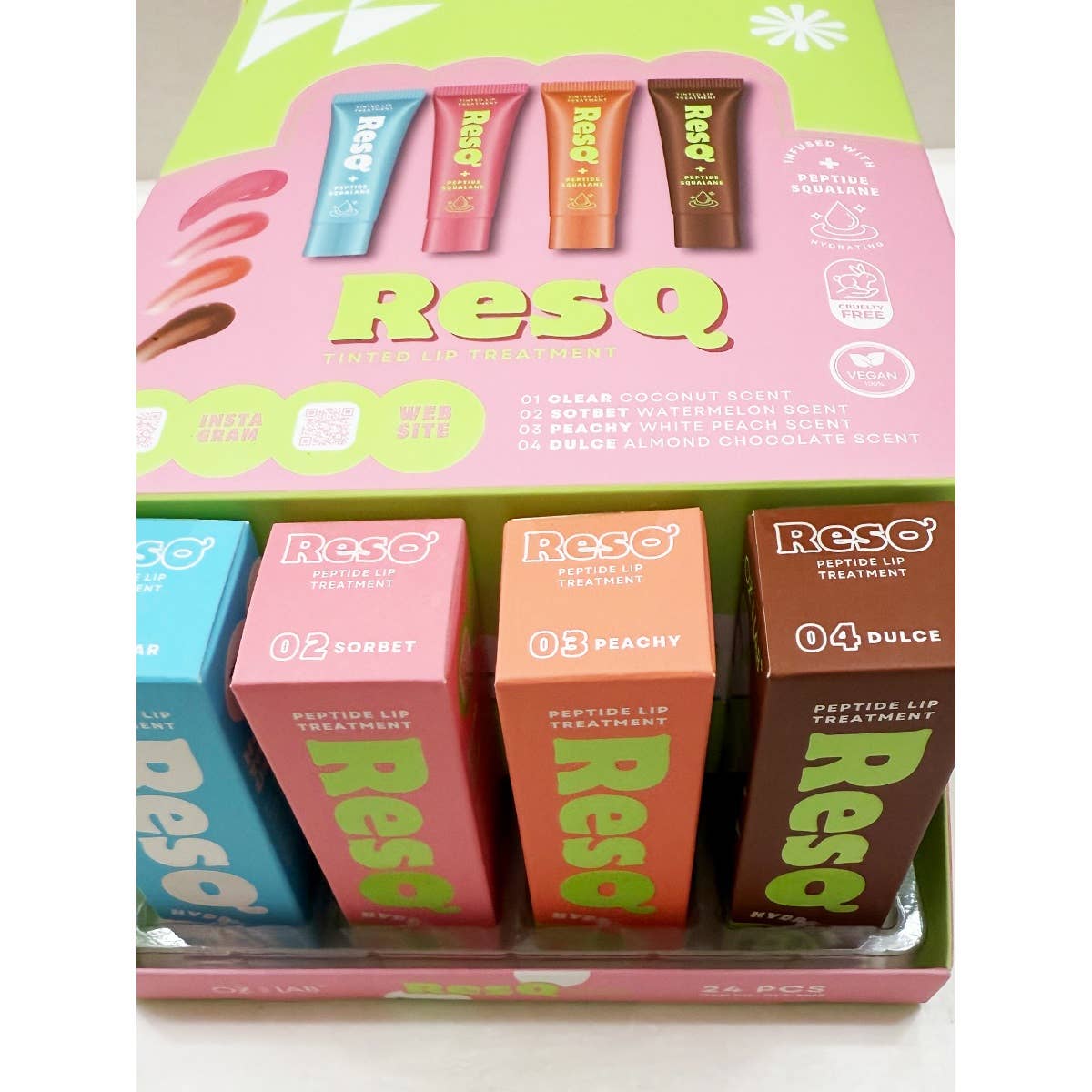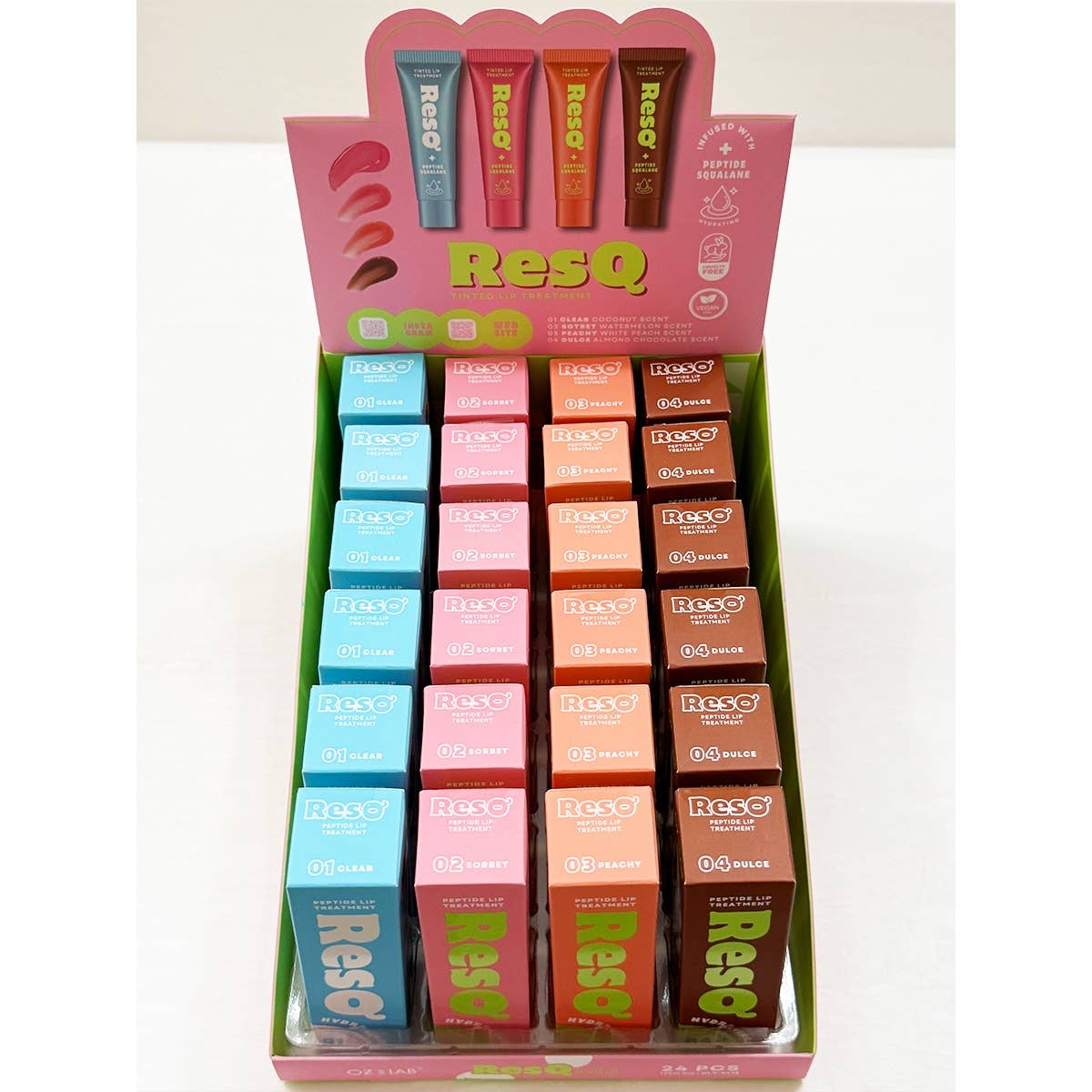 4 Shades of Pepside Lip Treatment -Introducing ResQ, a luscious tinted lip treatment infused with Peptides and hydrating Squalane, designed to nourish and enhance your lips. Available in four shades. ResQ delivers a pop of color while ensuring lips stay smooth and moisturized. Perfect for any occasion, this lip treatment combines care and color for effortlessly beautiful lips. -For soft, hydrated lips, apply day or night as needed. -Premium Quality -Individually packaged