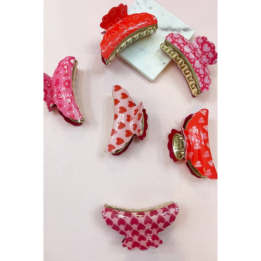 Assorted Heart Hair Claw -These Valentine's Theme hair clip match your any Sweetheart outfits or Valentine's party OOTD. -Gold Part is made scratched and chipped intententionally. We can't issue refund or store credit. -Size: 3.5 Inch W X 1.5 Inch -6 Styles Heart Hair Claw Assorted