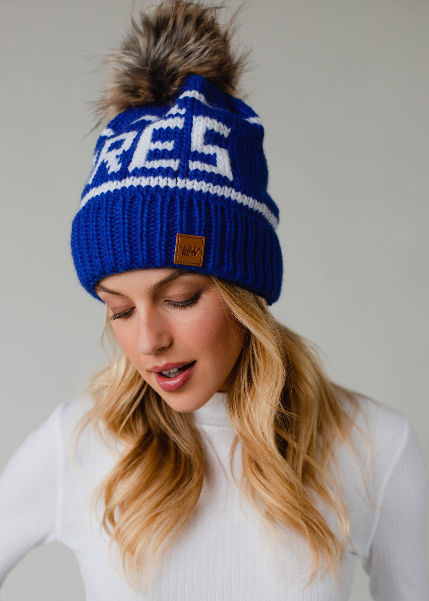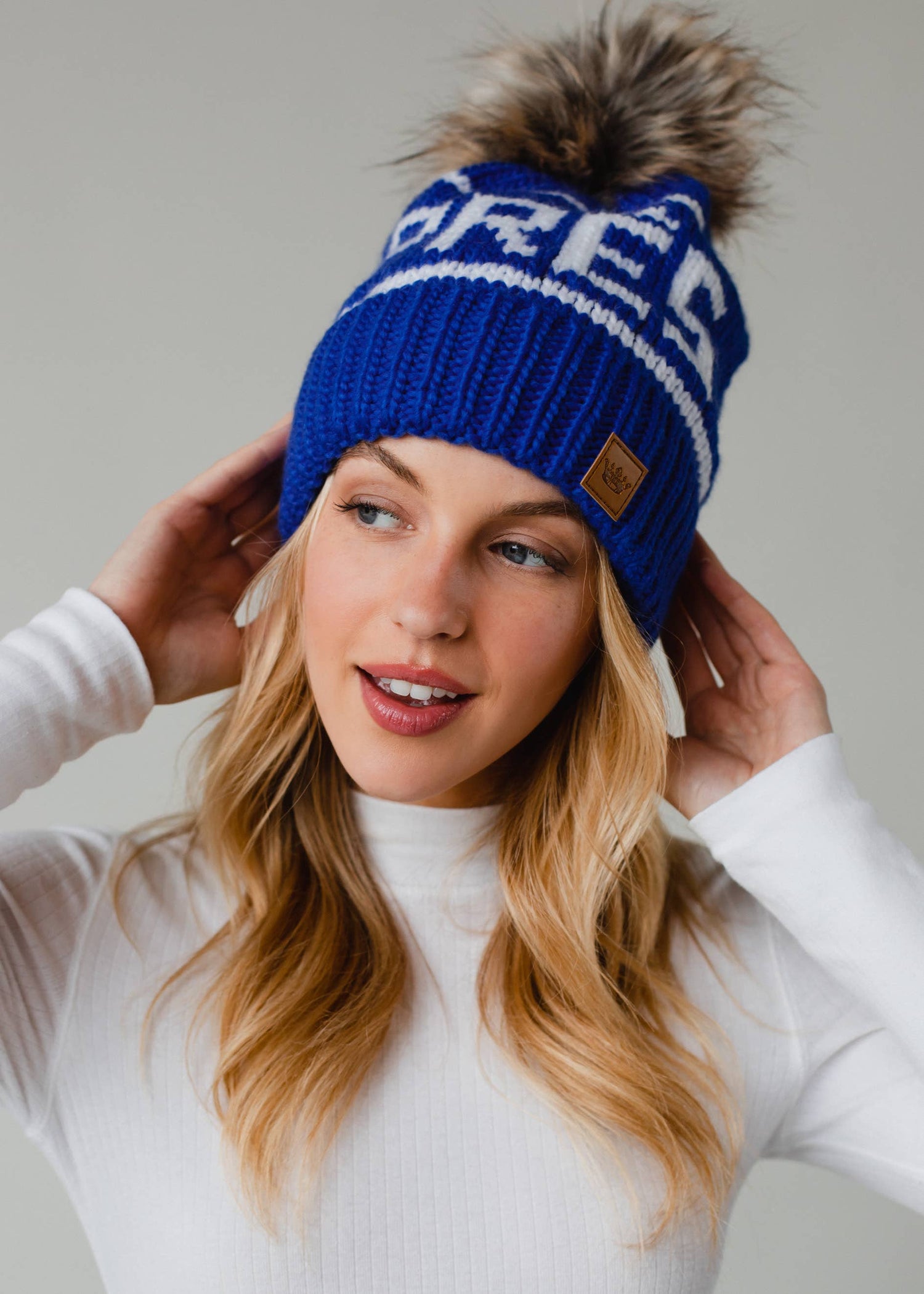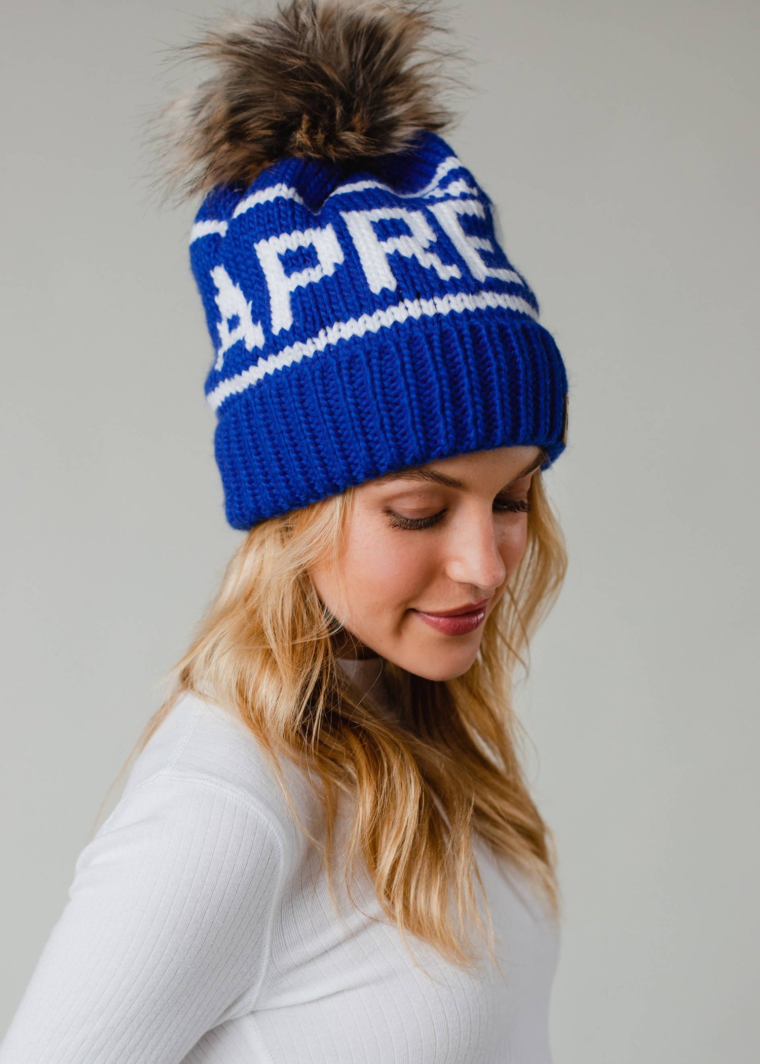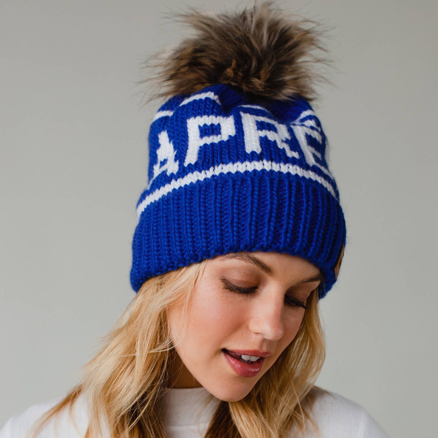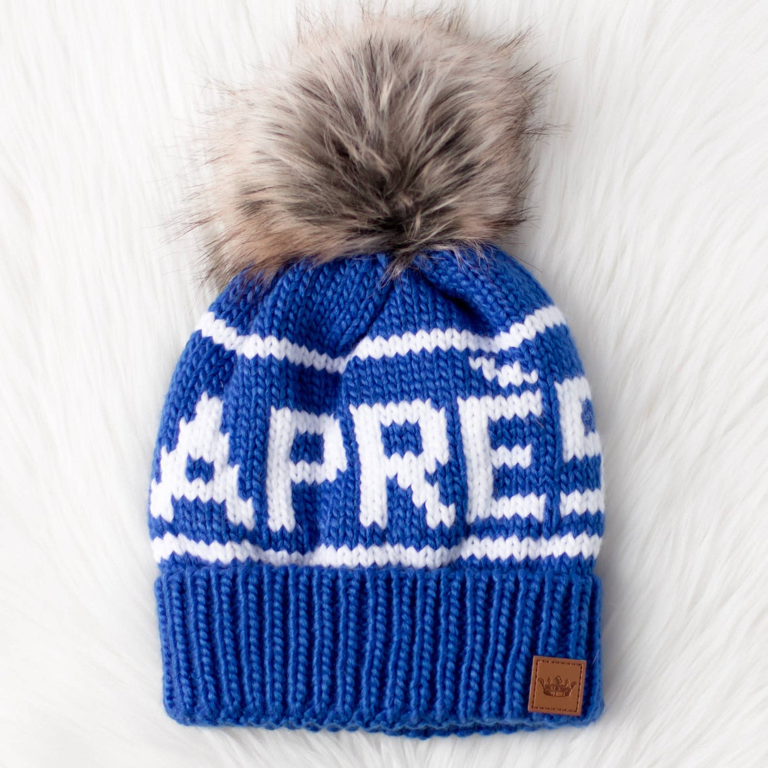 Blue & white Apres knit hat Natural, faux fur pom accent, Fleece lined 100% Acrylic