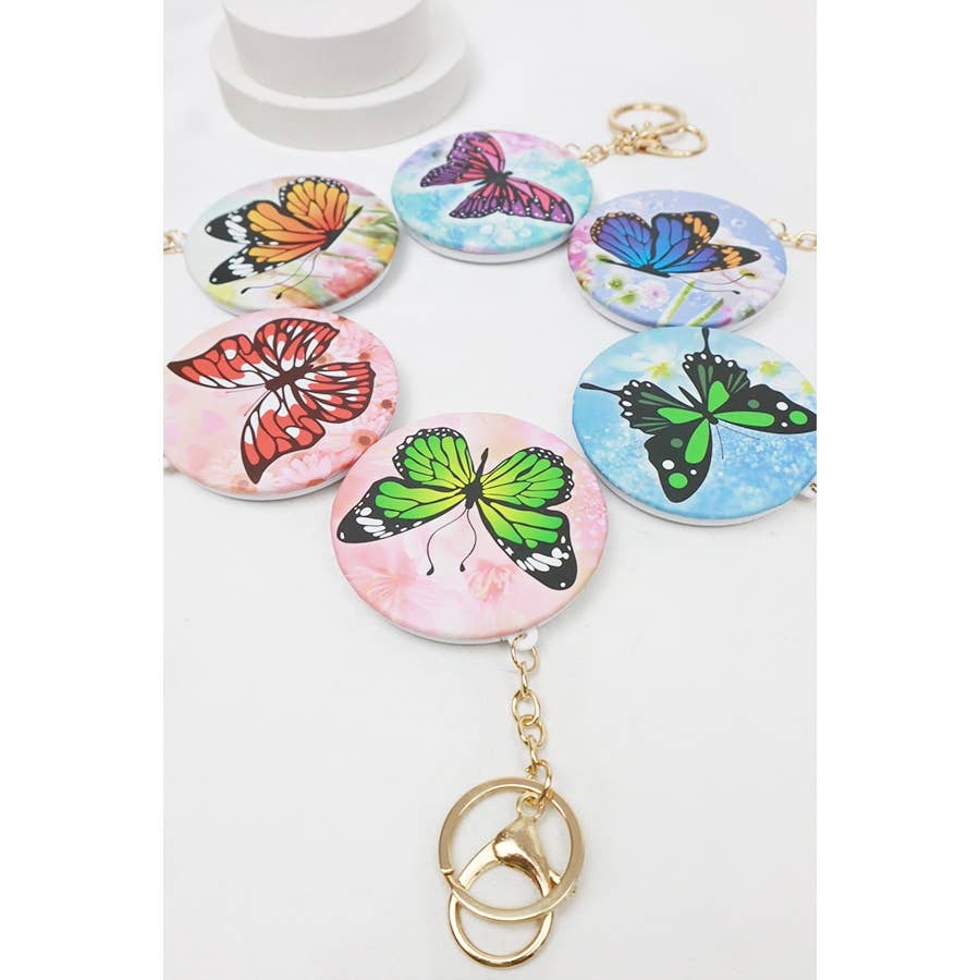 Butterfly Double Side Mirror with Key Ring -These travel makeup mirrors are printed with 6 different butterfly and these magnifying mirrors are 2 sided design, with regular view on one side and double magnification on the other, relieve eye fatigue, convenient to use. -6 Styles Assorted