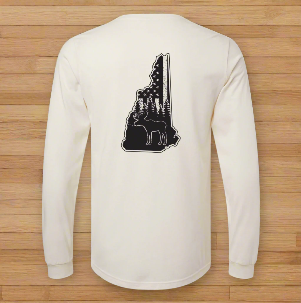 The comfiest long sleeve you’ll ever own! Relaxed fit with quality fabric makes it the perfect layering piece after a day on the lake or trails! Unisex styling makes it perfect for both men and women. Features a one of a kind NH Flag Treeline & Moose graphic on the back with Up North logo at the left chest!