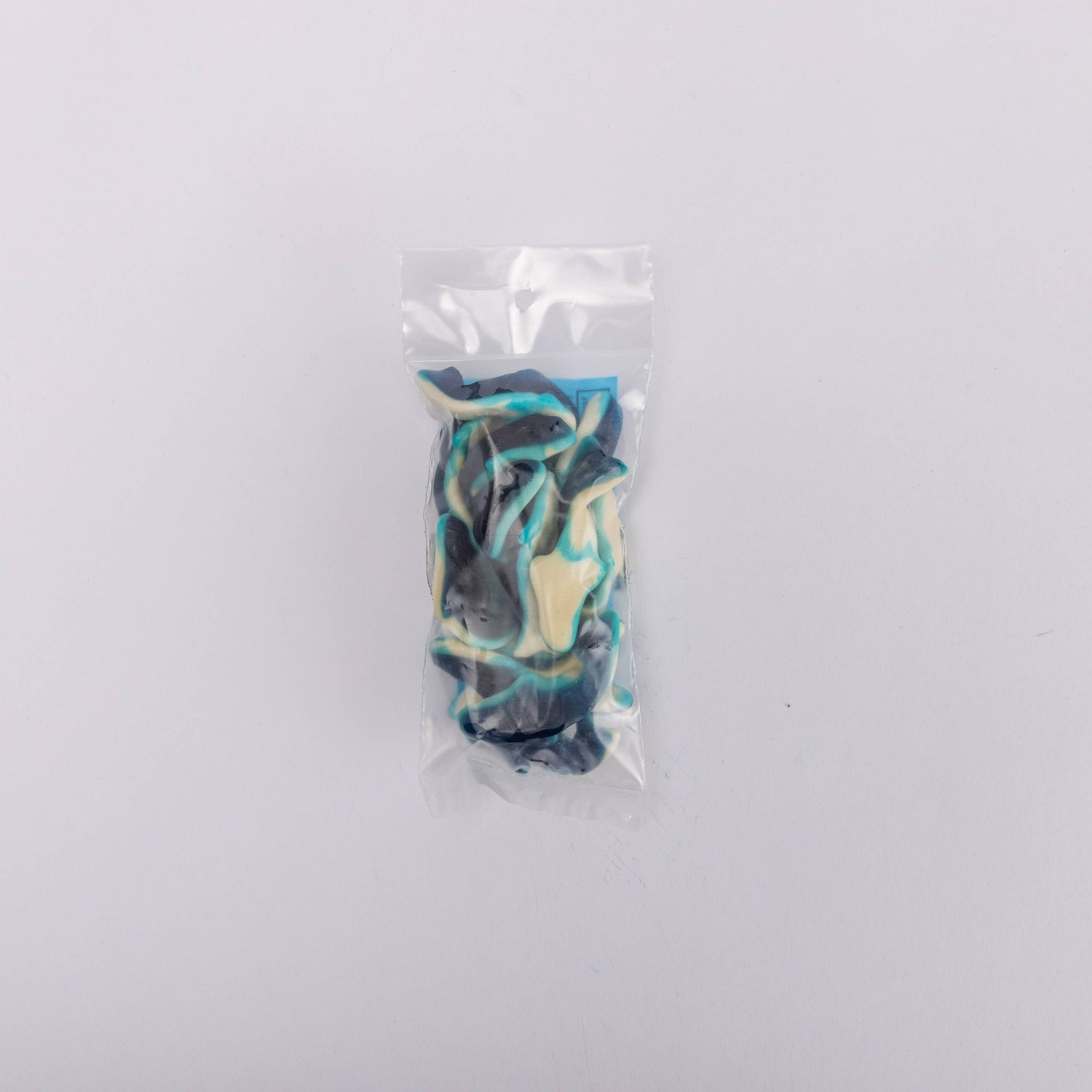 Enjoy Gummi Blue Sharks, a Gummy treat from The Penny Candy Store. Made in the USA and using recyclable packaging, these sweets blend tradition with sustainability with a 12-24 month shelf life.