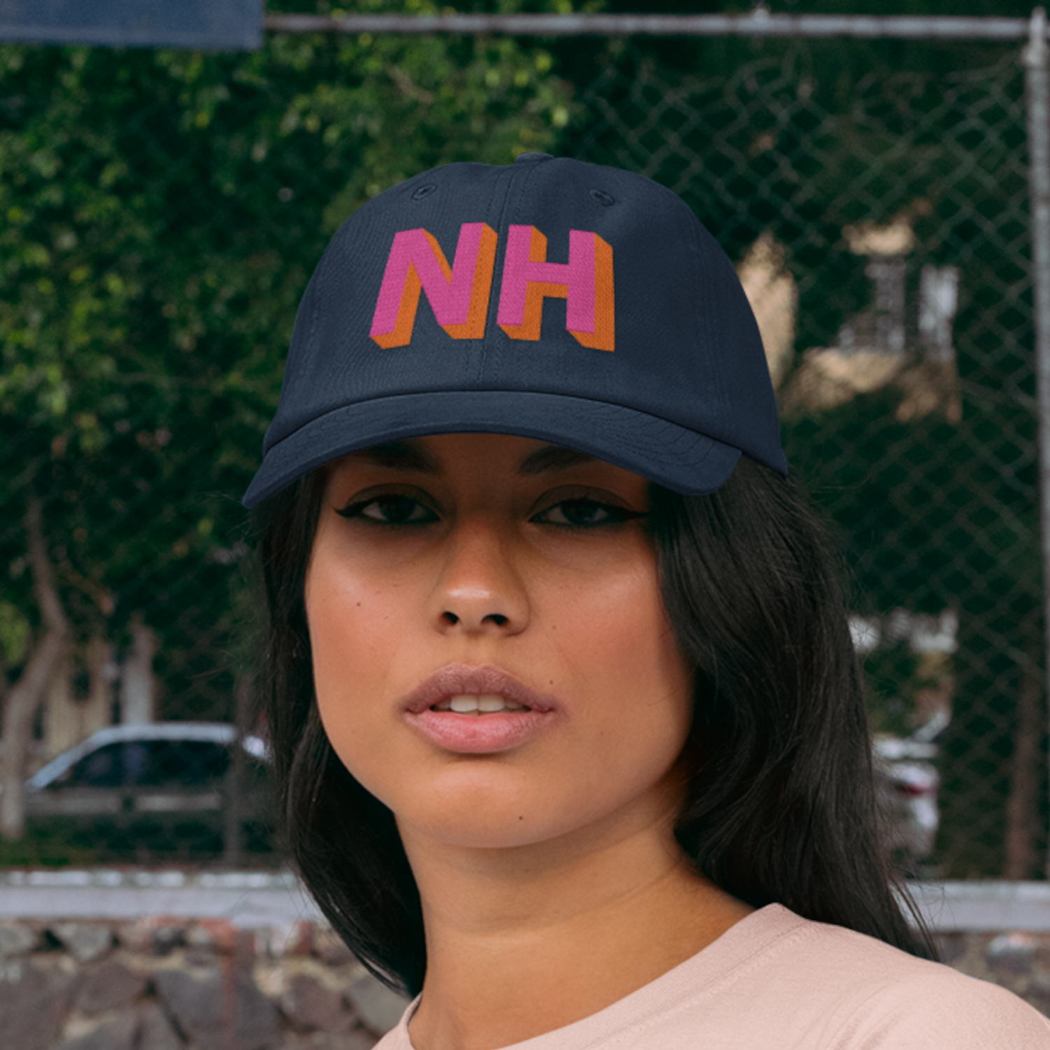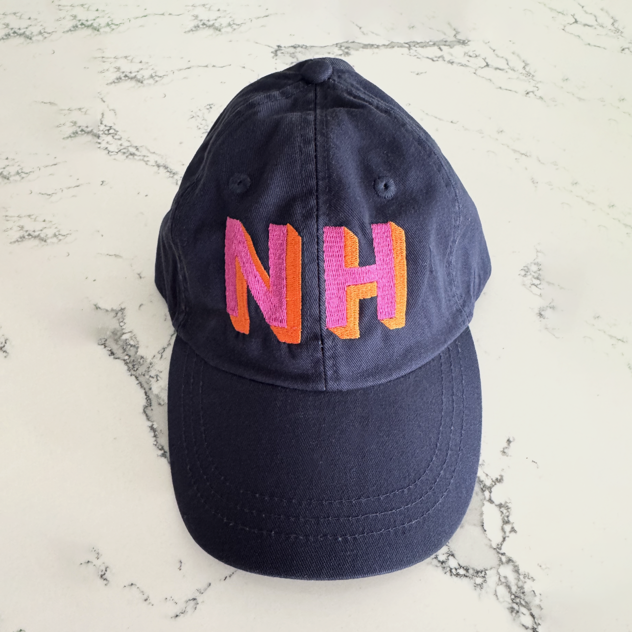 NH Navy Dad Hat featuring eye-catching custom block letter embroidery in hot pink and vibrant orange! This hat is designed to make a bold statement and add a burst of color, all while maintaining exceptional quality and style.