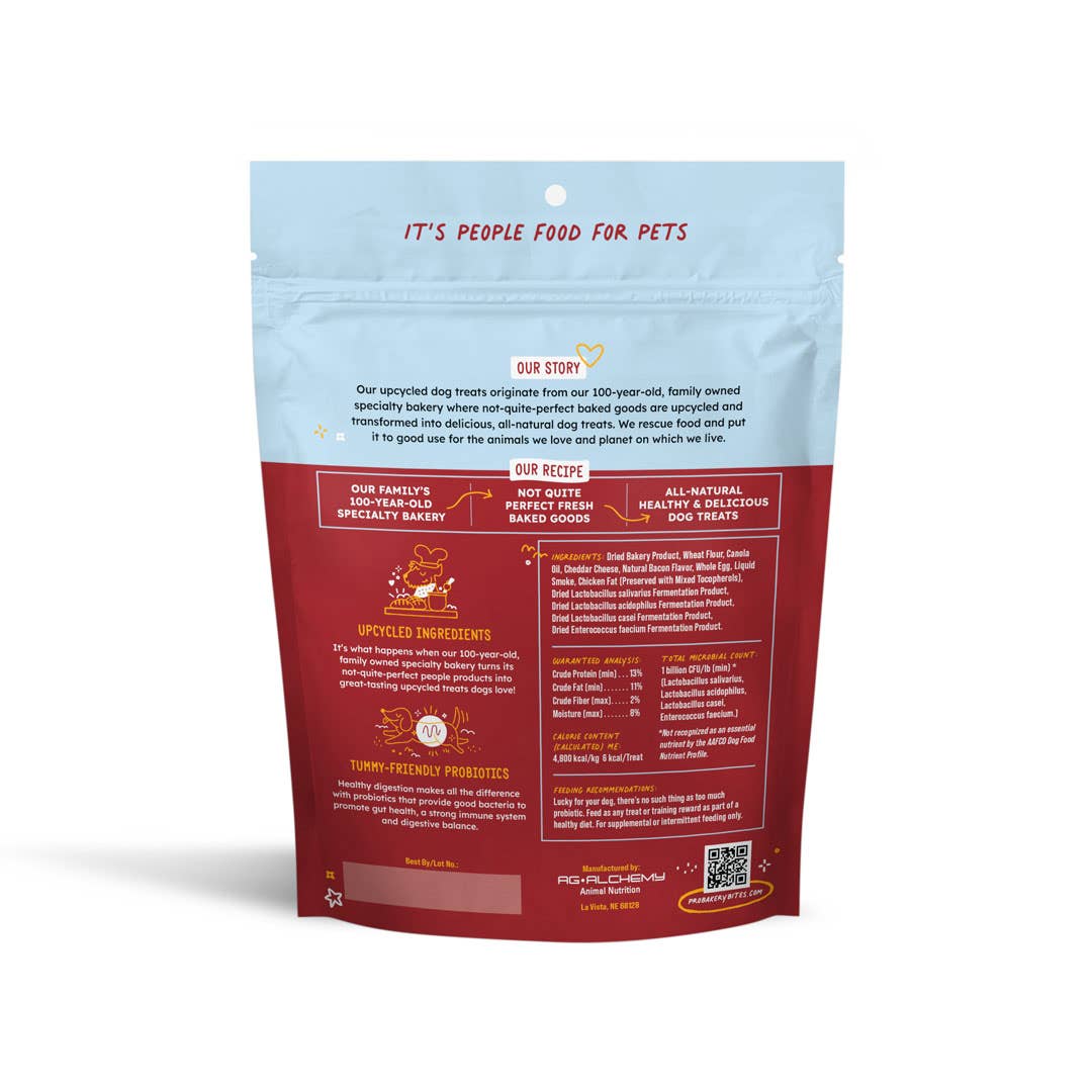 Ingredients: Dried bakery product, wheat flour, canola oil, cheddar cheese, natural bacon flavor, whole egg, liquid smoke, chicken fat (preserved with mixed tocopherols), Lactobacillus salvarius Fermentation, Lactobacillus acidophilus Fermentation, Lactobacillus casei Fermentation, Enterococcus faecium Fermentation.