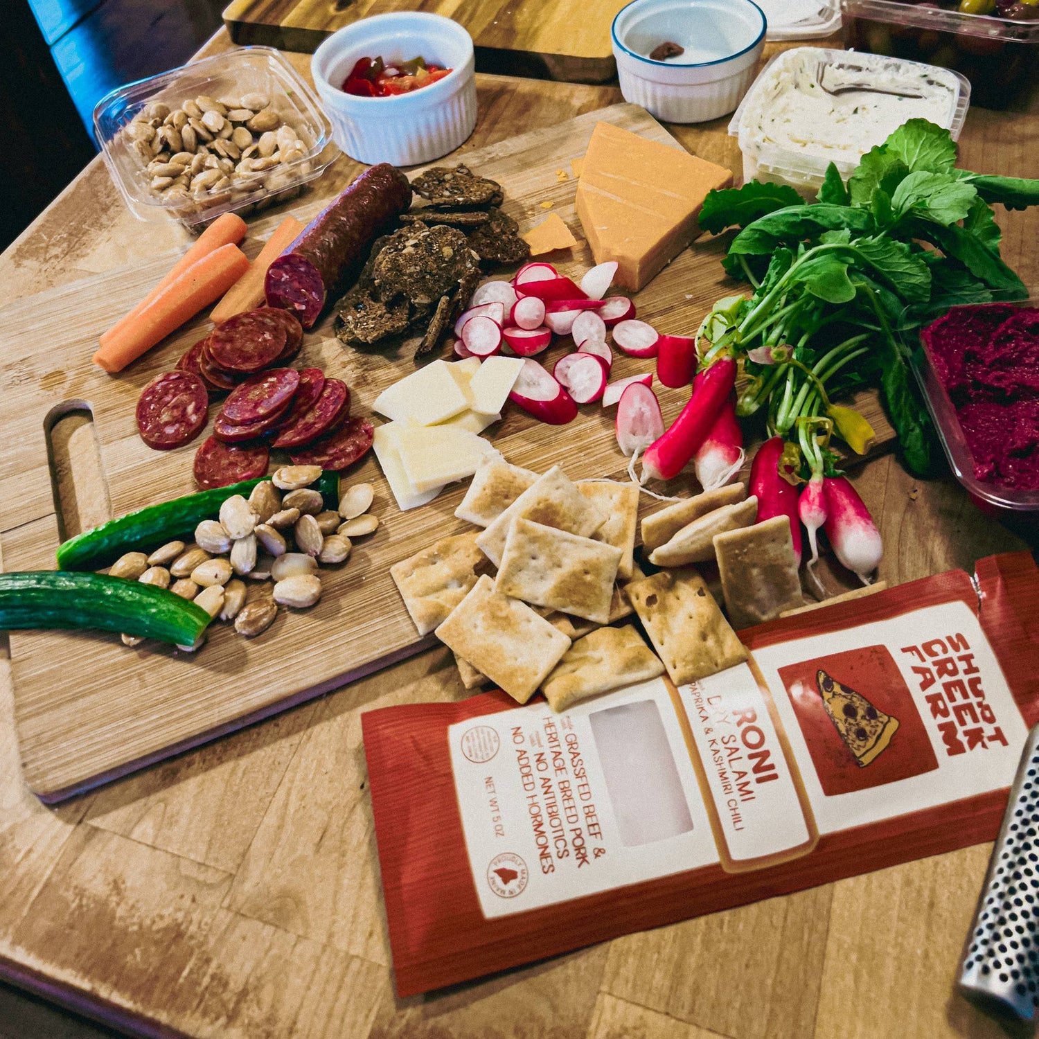 Uncured pork and grassfed beef salami with smoked paprika and Kashimiri chili.