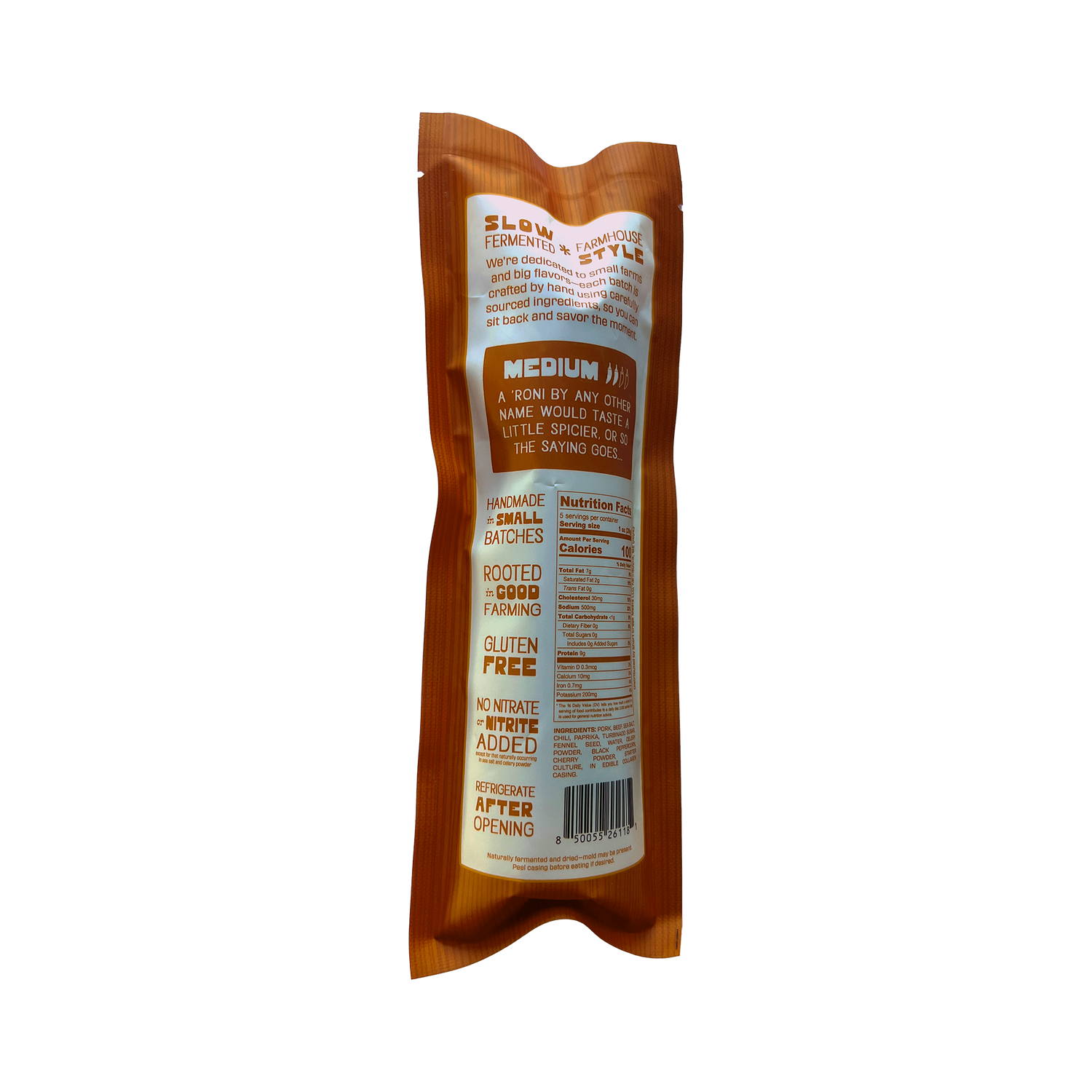 Is it pepperoni? Yes! But it's made just like we make our other farmhouse-style salami... slow fermented and naturally dried for a richer and more complex flavor than your bog-standard pre-sliced pepperoni. Not smoked, not cooked, no fillers or synthetic acidifiers. A bit spicier than average.