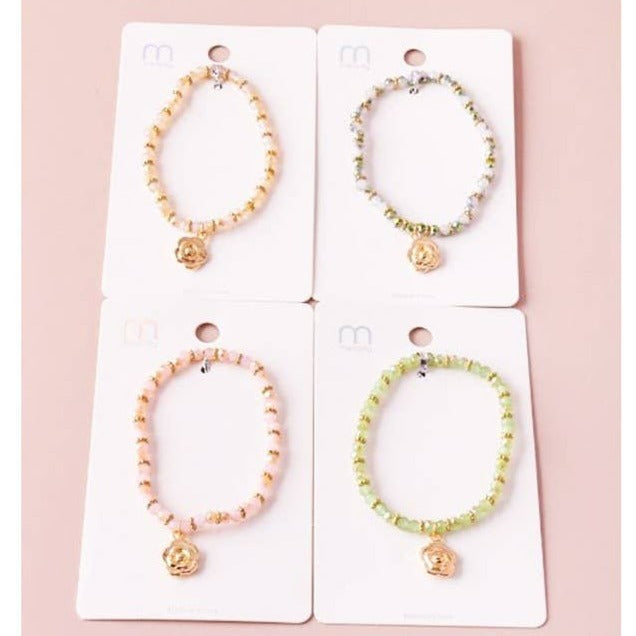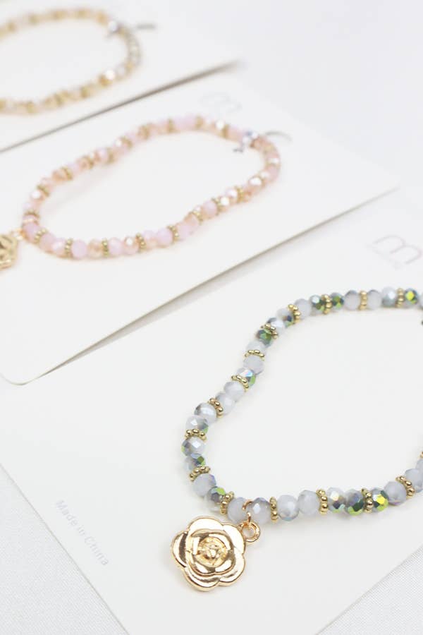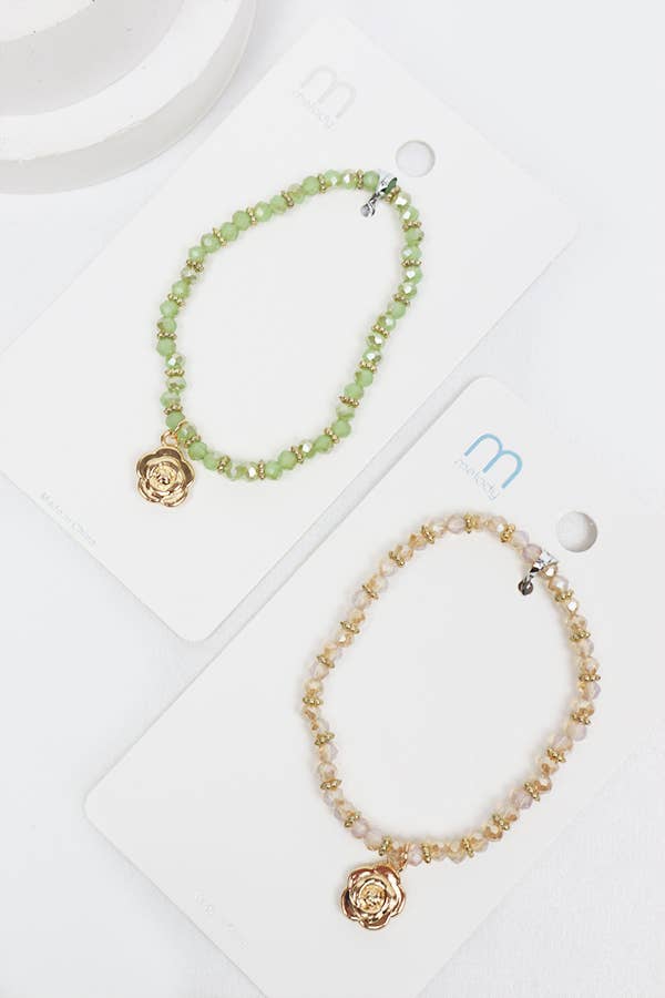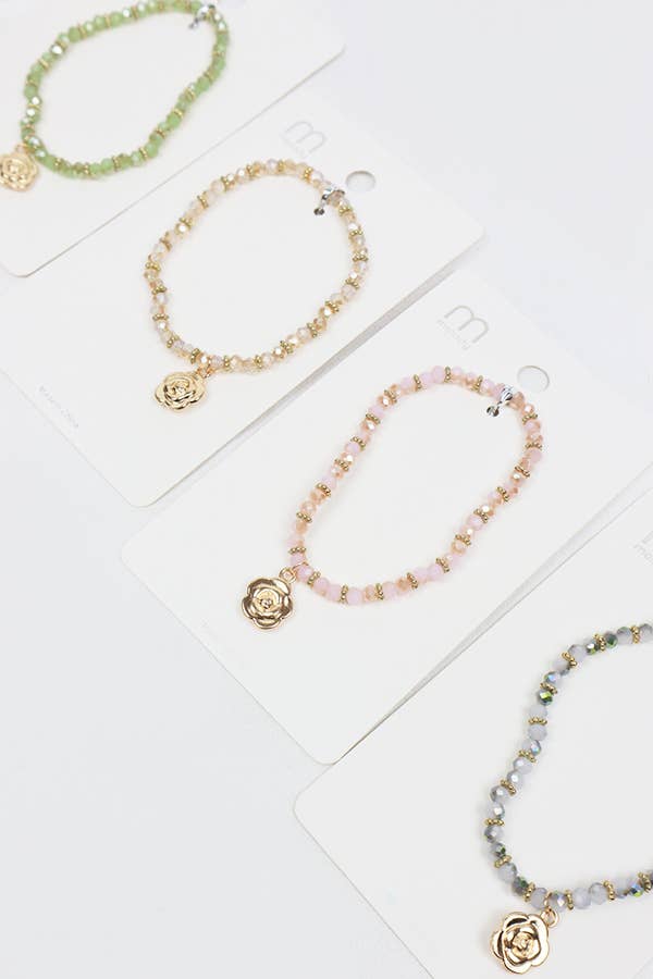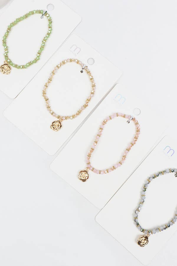 Rose Charm Crystal Bead Bracelet -Material: 60% Glass, 20% Plastic, 20% Metal -4 Color Bracelet Assorted