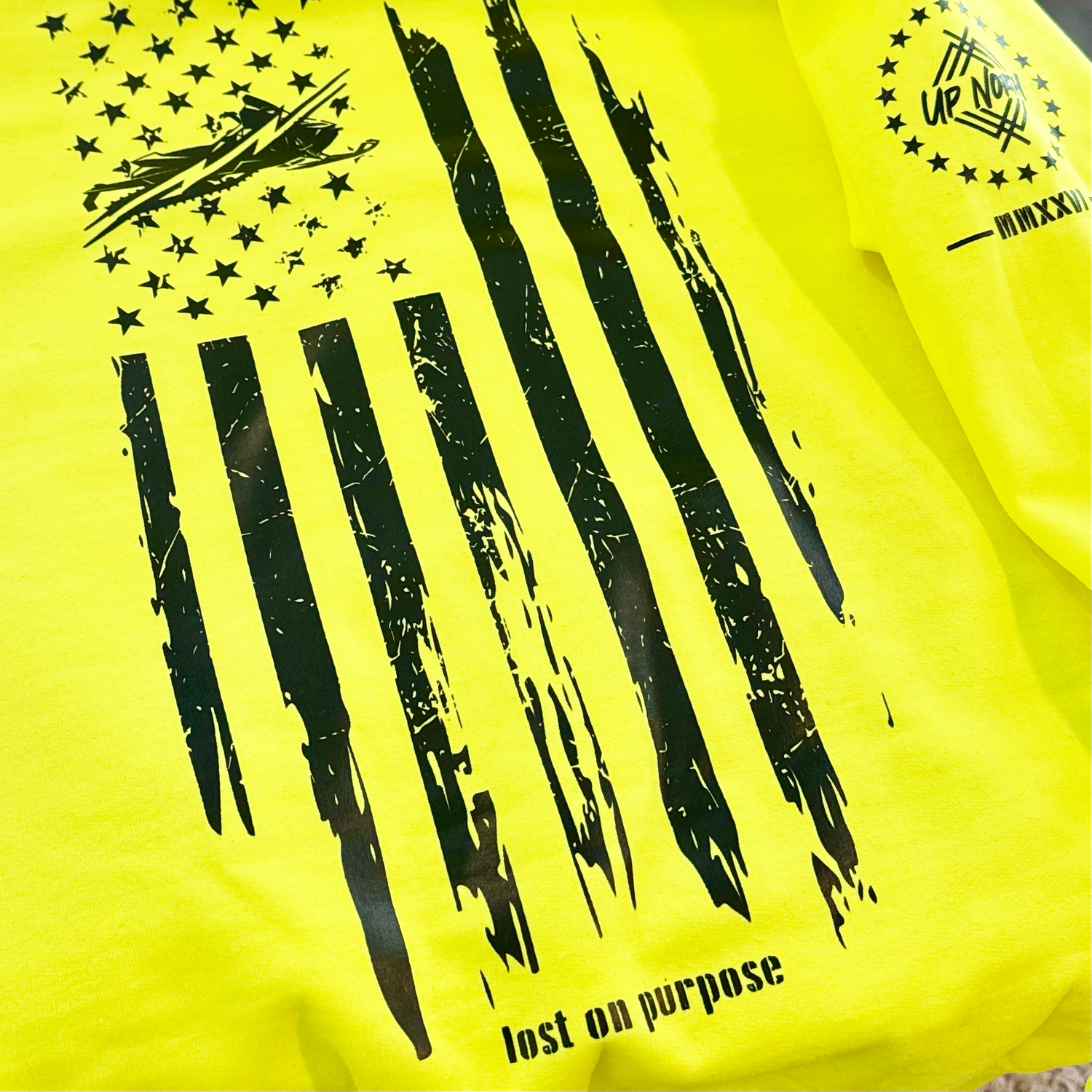 This unisex adult neon hoodie is made for snowmobilers who live for riding in Pittsburg, New Hampshire. Featuring our signature “RIDE” Up North, Pittsburg NH graphic at the left chest and a distressed American flag with sled detail on the back, this hoodie was designed for riders who are proudly Lost on Purpose.