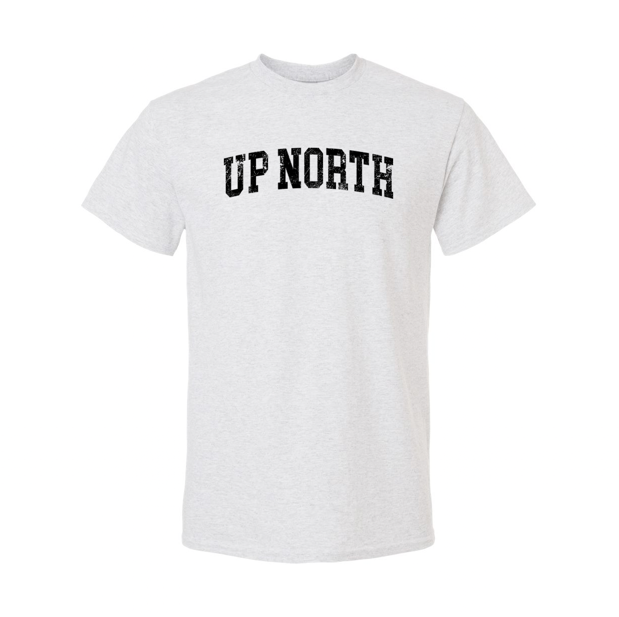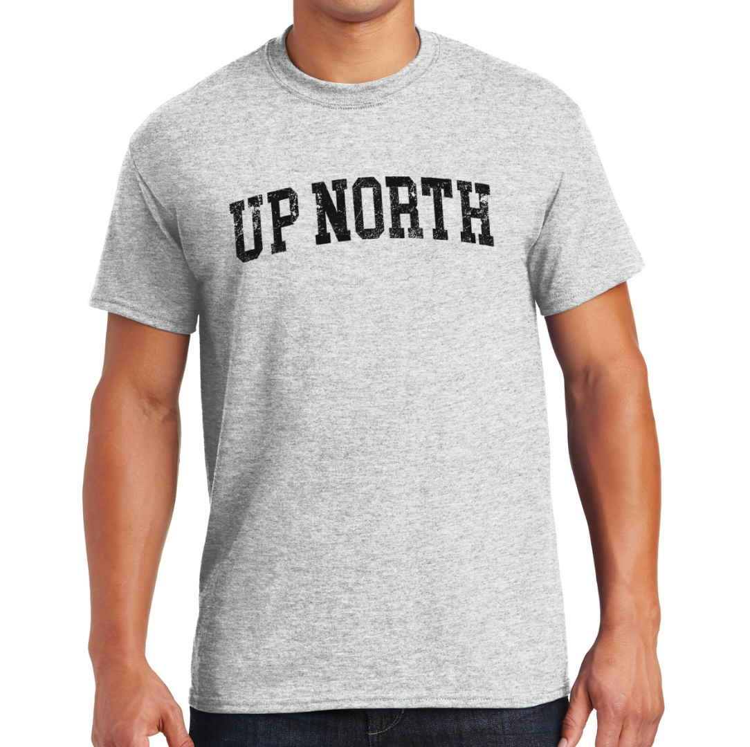 The perfect cozy tee for any guy or gal who loves it Up North!  Features an Up North Arched Varsity Type Logo at center front chest.