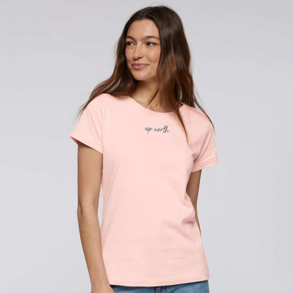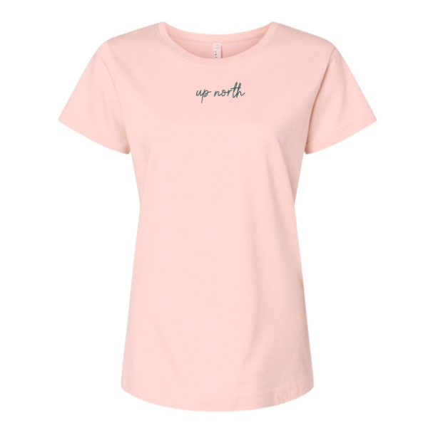 This v-neck tee will be your new favorite!! Relaxed fit styling makes it perfect for all ladies. Features a script up north logo at center front neck.
